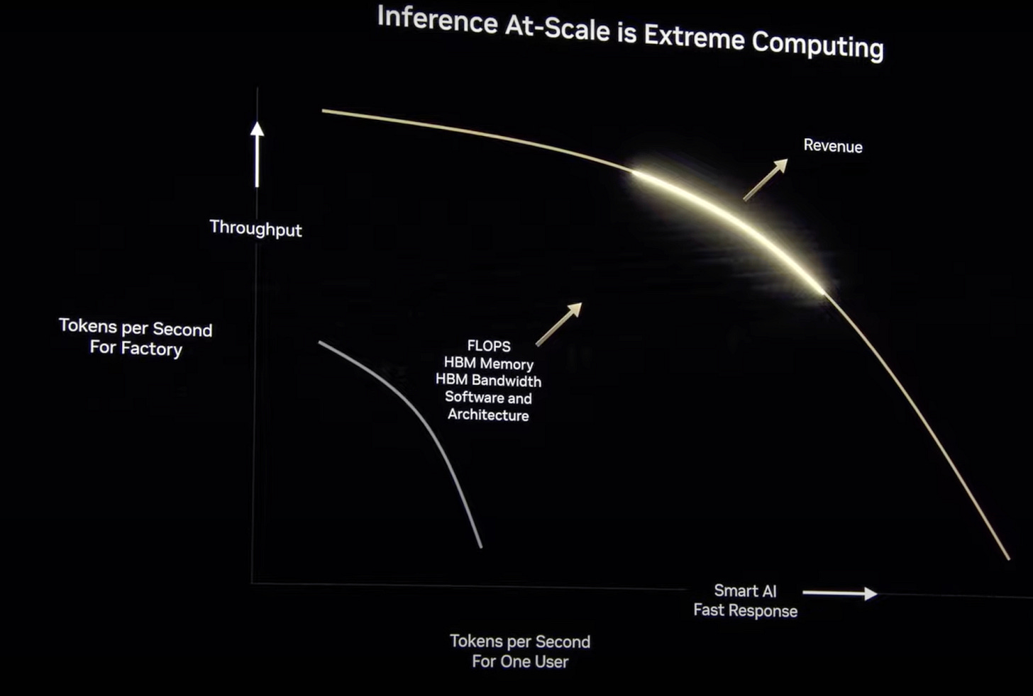 This tradeoff is crucial in the age of agentic AI. For example, Jensen Huang described how batching in AI systems—similar to how factory lines group tasks to increase manufacturing efficiency—can dramatically boost throughput. As real-time interactions, such as chatbots, require fast, low-latency token responses, a tension exists between throughput and latency. Blackwell helps balance this by enabling high-throughput, low-power token generation—critical for agentic systems that must think deeply but respond quickly.
